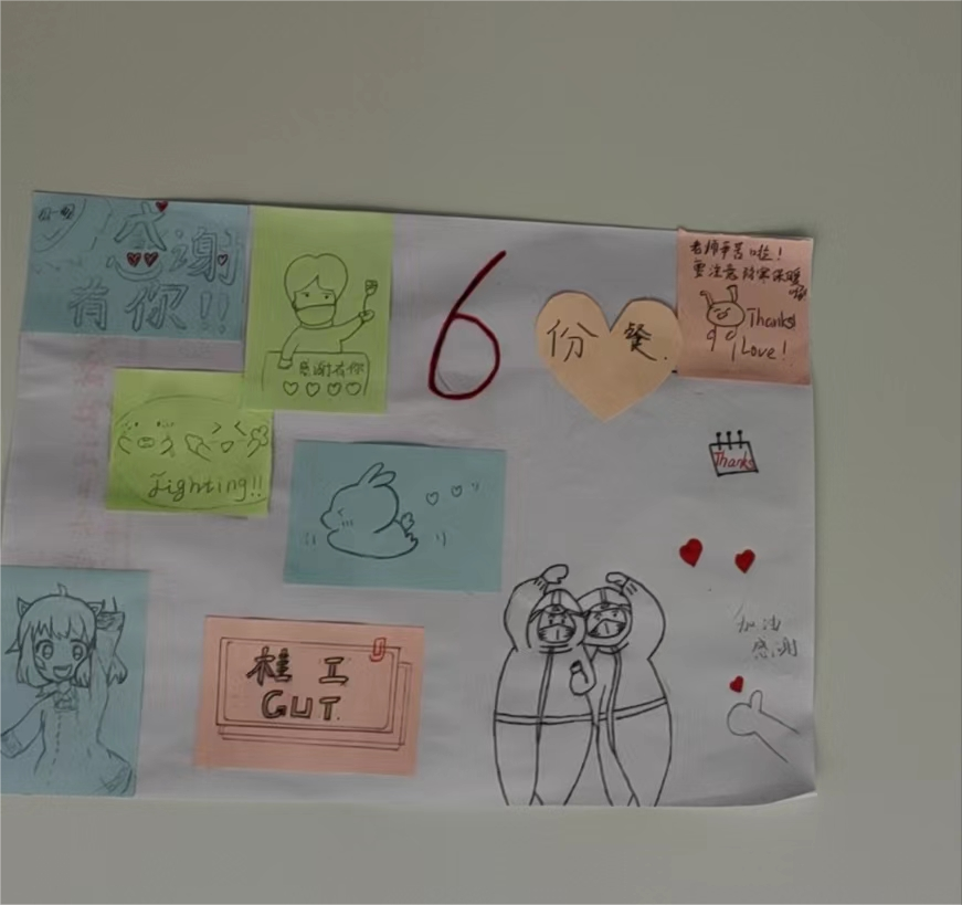 学院的其他教师也时刻关心着学院疫情防控志愿者的身心健康。在校外居住的黄孝华、李虹燕等教师主动联系,送来防疫物资;其他由于个人原因未参加志愿服务的教师们也积极通过教师微信群等向志愿者教师们的辛苦付出表示感谢,叮嘱做好防护。学院学生制作发布《志愿者风采 | 最可爱的他们,坚守着抗疫一线》《桂工同心战“疫”,感谢“疫”路有你!》等推文、制作的《老师辛苦,我们加油》等视频呼吁全体同学以积极的心态和强健的体魄抗击疫情,向老师们表示感谢,为他们点赞。学生在积极配合疫情防控工作的同时给老师们送来祝福,让志愿者老师们在艰难时刻感受到集体的温暖与力量。