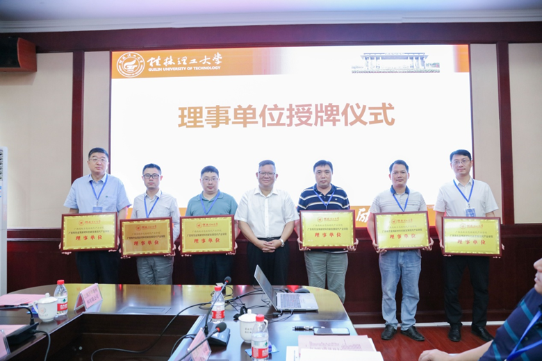 会上,学校党委书记邓军为本次会议致辞。他首先对本次会议的召开表示热烈祝贺,并向各位理事单位、各位嘉宾莅临会议表示诚挚感谢。他简要介绍了学校的基本情况,并期盼通过本次会议汇聚各理事单位的智慧与力量,对现代产业学院的建设发展进行更深、更广的战略性谋划和布局,尽快把学院建成立足广西、面向华南、辐射全国的有色金属新材料示范性产学研合作平台,为赋能国家和区域高质量发展贡献力量。随后,邓军书记为到会的14家理事单位进行授牌。