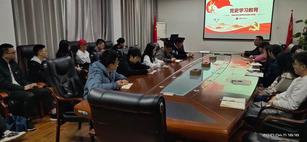 4月11日,我院本科生第三党支部在屏风校区2308会议室开展了党史学习教育主题党课,支部全体党员和积极分子参加了主题党课,党课由党支部书记单江涛主讲。