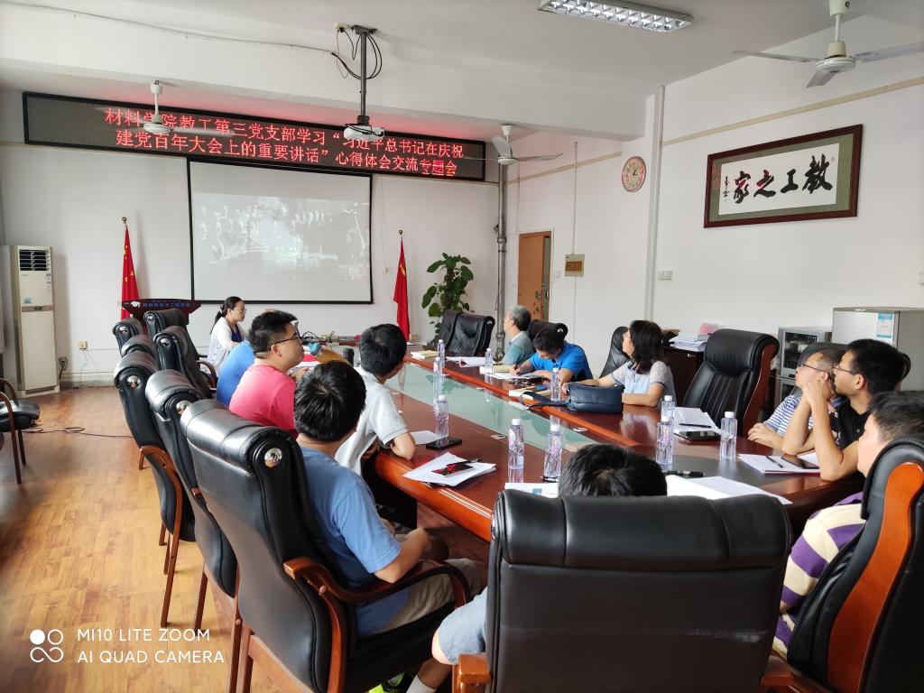 7月2日下午,学院教工第三党支部在2308会议室组织召开学习习近平总书记在庆祝中国共产党成立100周年上的重要讲话暨学习心得体会交流会,会议由支部书记刘红霞主持,支部全体党员参加。
