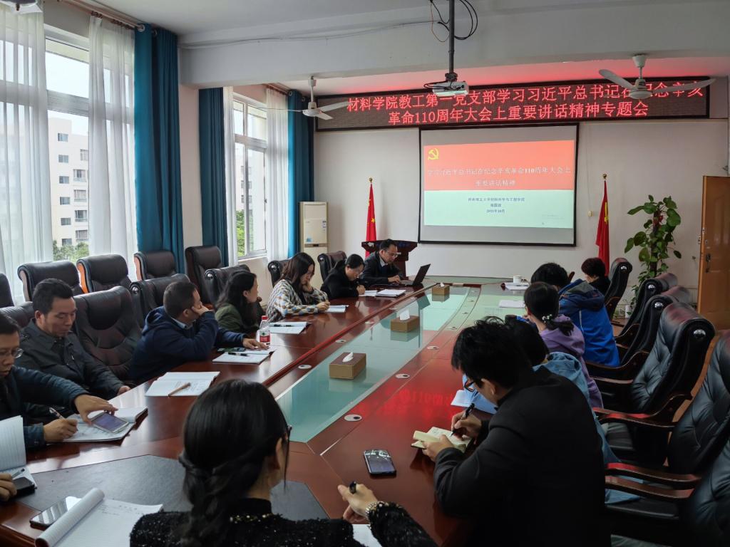 为深入学习贯彻习近平新时代中国特色社会主义思想,弘扬辛亥革命精神。10月22日下午,学院教工第一党支部在2308会议室组织学习习近平总书记在纪念辛亥革命110周年大会上重要讲话精神,会议由支部书记王春霞主持,支部全体党员参加。