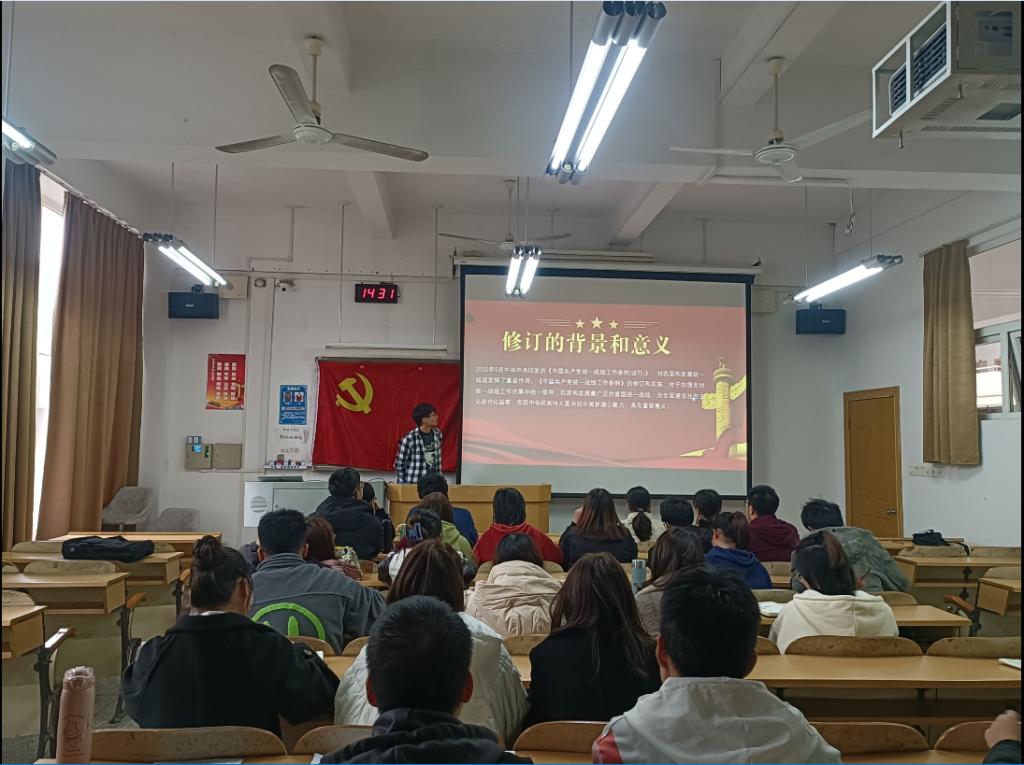 为了贯彻习近平总书记关于加强和改进统一战线工作的重要思想暨《中国共产党统一战线工作条例》,11月9日下午我院本科生第一党支部在屏风校区9203教室开展《中国共产党统一战线工作条例》专题学习会,奋力开创新时代”党小组会,本次会议由陈梓铭同志主持。