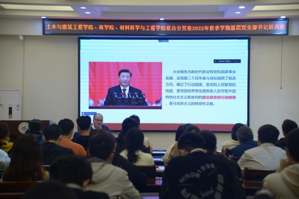 为深入学习宣传贯彻习近平新时代中国特色社会主义思想和党的二十大精神,全面提升党支部组织力和党支部书记的履职能力,强化党支部政治功能,充分发挥党支部战斗堡垒作用和党员的先锋模范作用。11月15日晚,土木与建筑工程学院、商学院、yL23411永利官网登录联合分党校2022年秋季学期基层党支部书记培训班在4204会议室进行。学校马克思主义学院副院长蒋晓俊同志讲题为《学习贯彻党的二十大精神,以中国式现代化全面推进中华民族伟大复兴》专题党课。屏风校区三个学院所属党支部支委及师生党员代表参会。