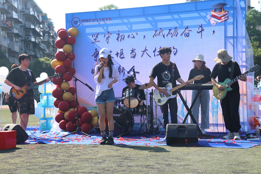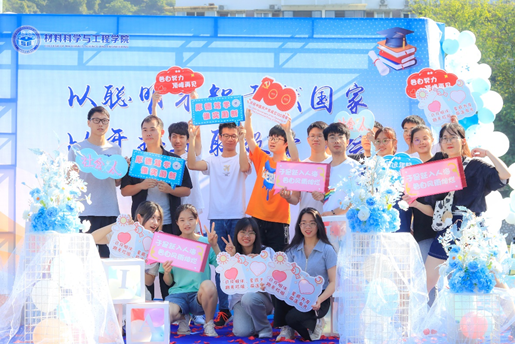 鲜花、气球和背景墙打造的梦幻现场,再搭配乐队的倾情演奏,让材料学子们一进入操场就惊叹于这特殊而又唯美的场景。在乐队和我院两位校级“十佳歌手”的助力下,现场气氛高涨。摄影师团队、老师和同学们入场完毕并整理好队形后,在李轶帆同学的领唱下,全体师生一起合唱《唱支山歌给党听》和《星辰大海》,唱响红色主旋律,坚定信念跟党走。