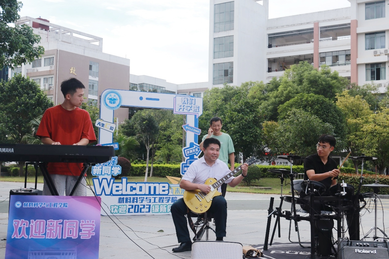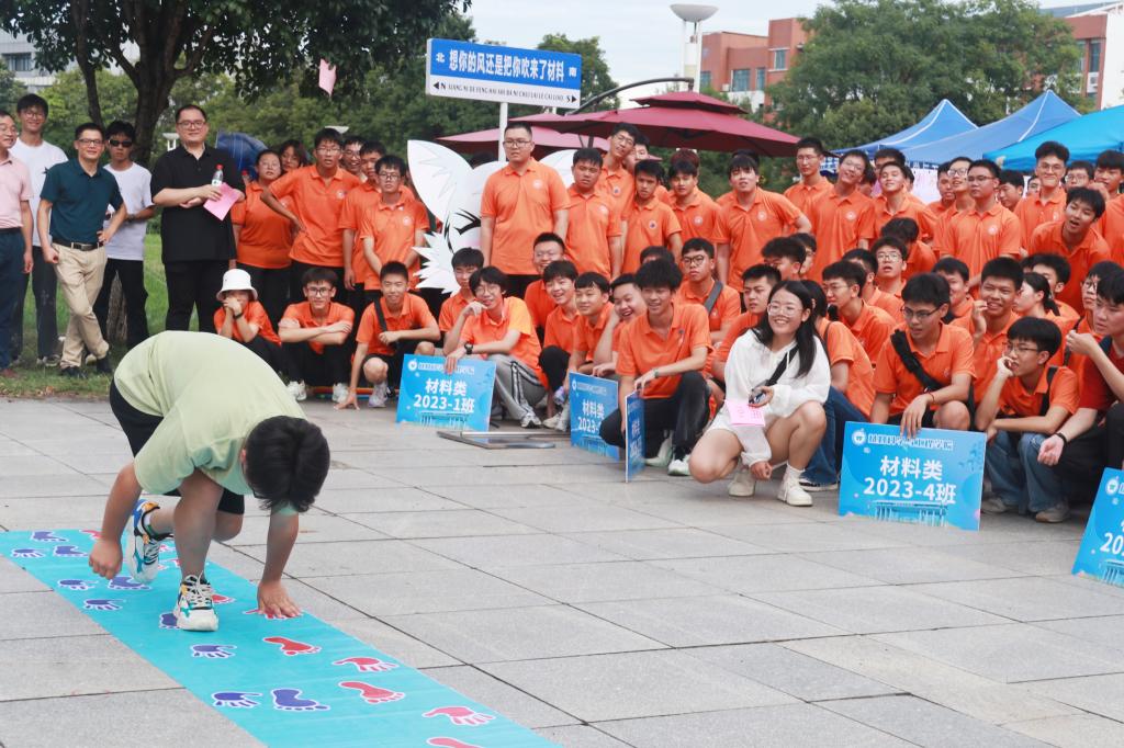 活动现场登时热闹非凡。本次新生见面会共设置“勇往直前”“飞得更高”“一站到底”“发现材料微观世界”四个素质拓展项目,八个新生班级两两组合,在场地上的四个项目中竞争角逐。在现场比拼的白热化阶段,龙飞院长拿起吉他演奏了一首《光辉岁月》,缓解了现场比赛的紧张气氛;2023级新生班助们也组成了一支乐队,带来了一首《光年之外》为同学们加油助威。