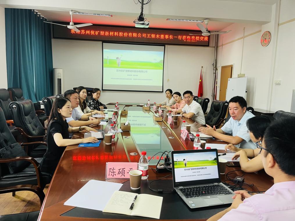 苏州优矿塑新材料股份有限公司王银木董事长一行莅临我校交流9月18日上午,苏州优矿塑新材料股份有限公司王银木董事长一行4人莅临我校交流,我院副院长王茗、学校人事处副处长王盛在屏风校区2308会议室热情接待了到访客人,我院和人事处相关教师参与座谈会。 王茗副院长代表学院对王银木董事长的到来表示热烈欢迎,并介绍了我院的基本情况,王银木董事长对我院的热情接待表示感谢,并委托随行周部长简要介绍了苏州优矿塑新材料股份有限公司的基本情况。接着...2023-09-19