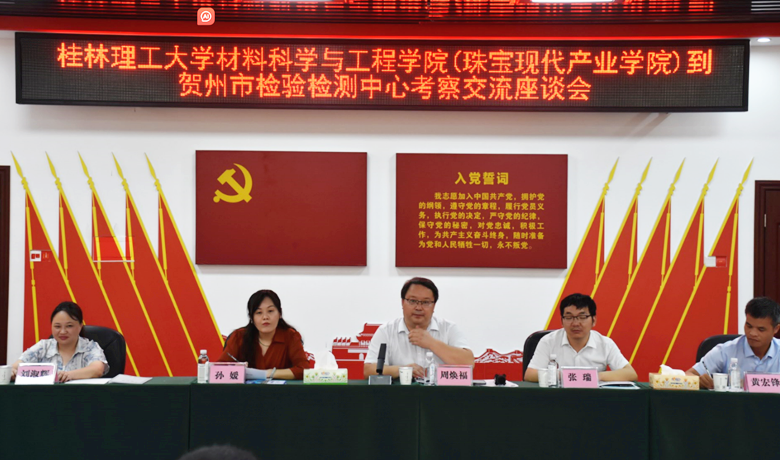 贺州市检验检测中心及贺州市方鼎新材料有限公司赴我院调研交流7月13日,贺州市检验检测中心党组成员、副主任韦福广一行及贺州市方鼎新材料有限公司黄国栋董事长一行联合到我院进行交流调研。我院院长周焕福热情接待了来访客人并主持了座谈交流会。教育部重点实验室副主任(主持工作)刘远立、副院长张瑞、学院相关教研室负责人及教师参加了座谈交流。周焕福代表学院对韦福广、黄国栋等的访问交流表示了热烈欢迎,并简要介绍了学院科教团队、教学科研平台等的基本情况,表达了希望与贺州市检...2024-07-15