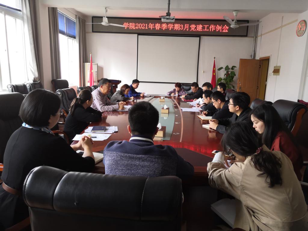 【党建月例会】学院召开2021年春季学期3月党建工作例会3月18日上午,学院在2308会议室召开2021年春季学期3月党建工作例会,会议由党委书记李治同志主持,全体党委委员、支部书记和院办主任参加。会上,李治同志详细传达了学校党建工作例会内容,并就学院目前入党培养人员情况向与会人员进行了说明。他要求支部书记再次统计更新支部所属入党培养人员情况,坚持成熟一个发展一个,严把发展党员“入口关”,确保发展质量。李治同志指出,今年是建党100周年,是“十四五”规划开局之年,...2021-03-18